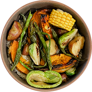 Ensalada de estación fresca y colorida con quinoa, hojas verdes, frutilla, cabutia asada, ricota y un vibrante dressing de naranja.