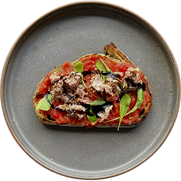 Tostón de hogaza crujiente con tomate fresco, atún jugoso y suave toque de oliva.